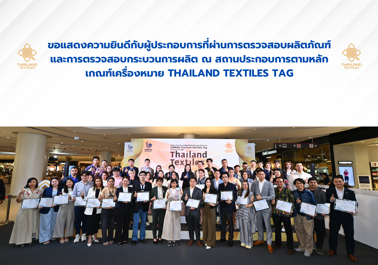ขอแสดงความยินดีกับผู้ประกอบการที่ผ่านการตรวจสอบผลิตภัณฑ์และตรวจสอบสถานประกอบการ ตามหลักเกณฑ์ของเครื่องหมายคุณภาพสิ่งทอไทย (Thailand Textiles Tag) ปี พ.ศ.2568